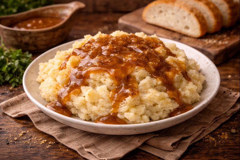 Gravy, often made from meat drippings, added richness and made use of every available resource. Together, they formed a dish that symbolized fullness and warmth, especially during colder months or communal meals.